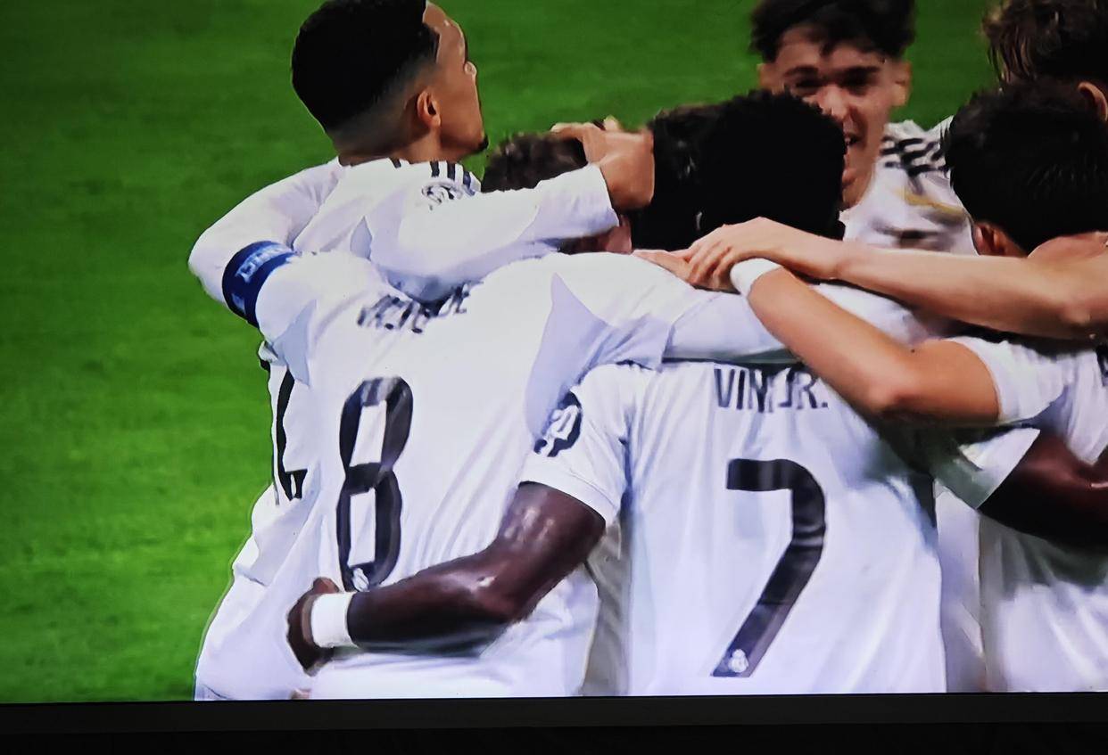 上半场的屠杀还没有结束。第42分钟,皇马在曼城禁区前沿打出了一次令人赏心悦目的团队配合。小将皮塔奇将球回做给卜拉欣·迪亚斯,迪亚斯面对防守,轻巧地送出一记挑传,皮球越过曼城防线,坠向小禁区附近。巴尔韦德拍马赶到,他没有选择直接射门,而是在电光火石之间,用一个极其潇洒的挑球动作,过掉了扑上来的曼城中卫格伊。随后,他不等皮球落地,直接凌空爆射,将球轰入网窝。3-0!帽子戏法!在完成这记充满想象力和技术含量的进球后,巴尔韦德张开双臂,接受着来自伯纳乌八万多名观众的顶礼膜拜。这是他职业生涯首次上演帽子戏法,而这三个进球,只用了短短22分钟。